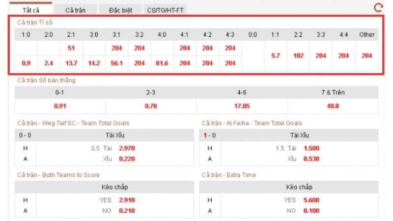- Hàng trên: Tỷ lệ cho tỷ số theo chiều đội chủ nhà – đội khách.